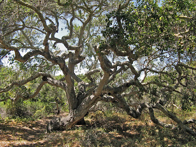 Not all coast live oaks reach swingable stature. I remember a surprising encounter with one as a Botany Novitiate. We were receiving the Teachings of the Order on a steep rocky slope covered with chaparral, examining leaves of woody shrubs, speaking knowingly in Latin. The concave leaves with spiny margins belong to Quercus agrifolia, the coast live oak ... what?! Yes, sometimes the wisdom we are given is not what we expected.