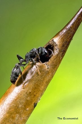 The bullhorn acacia is a well-armed desert tree, with long spines that deter browsers in ways both obvious and surprising.  Obviously the sharp-tipped spines discourage larger animals, but they don’t do much against insect pests and fungal pathogens.  Fortunately they also serve as ant homes, and in fact, the acacias strive to make the neighborhood attractive to ants by providing nutritious food via extrafloral nectaries.  It’s worth the investment.  The ants sting anything that tries to eat the leaves, from caterpillars to cattle.  Furthermore, acacias with healthy populations of the right kind of ant have a reliable supply of antibiotics to fight fungal infections on their leaves.  Their drugs are produced by bacteria living on the ants’ legs.  What a nice arrangement!  For more, see The Economist, Protect and Survive; and Science Daily, Ants protect acacia plants.