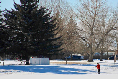 Early on my stroll through the park, I saw a man cross-county skiing on the thin snow and big patches of bare grass—so odd, even funny! But I didn't stare. Then I realized ... he was simply on his way to the lake, where he took off skiing near shore (shallow water sure to be frozen).