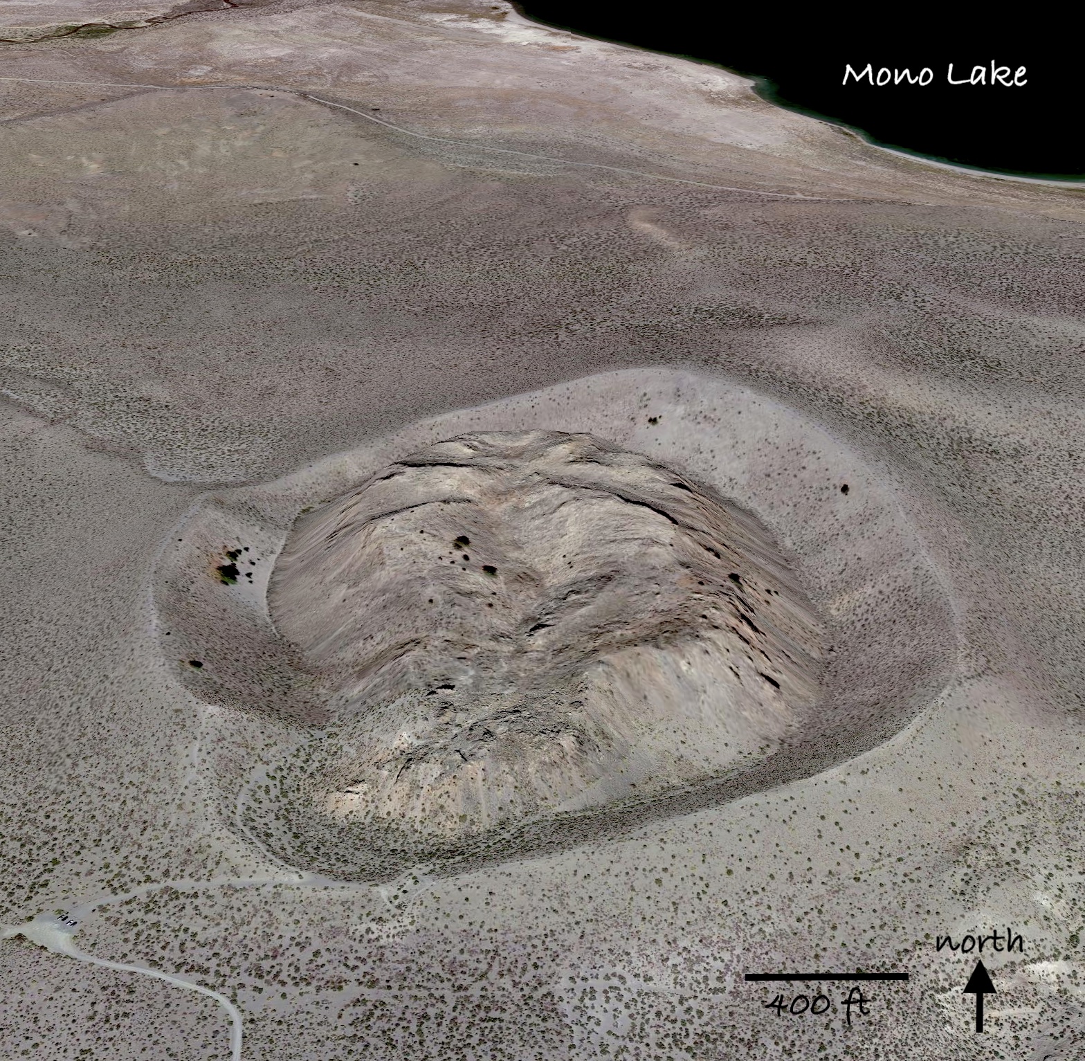 From Highway 120, about three miles northeast of the junction with Highway 395, a signed and passable dirt road led north to a parking area at Panum's base. It was empty except for the interpretive sign, whose explanation differed from what I had read, probably in the interest of simplification. Panum may be young, but already its life story is complicated.